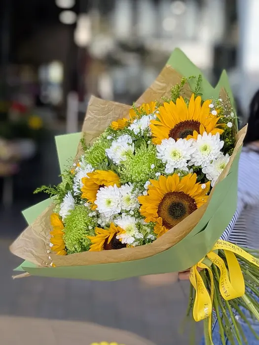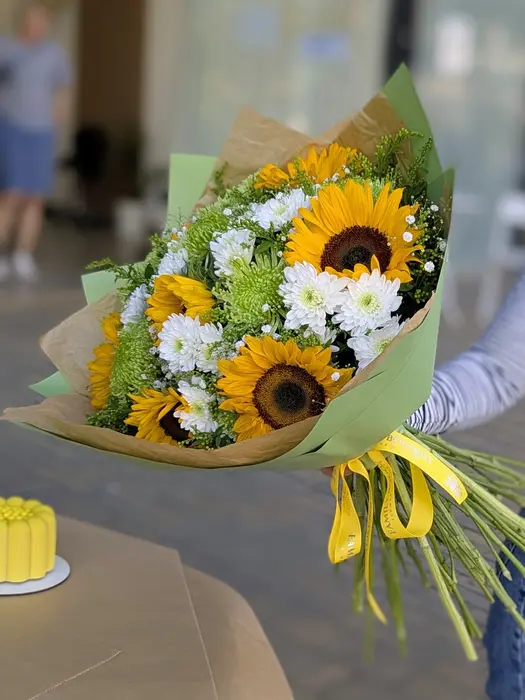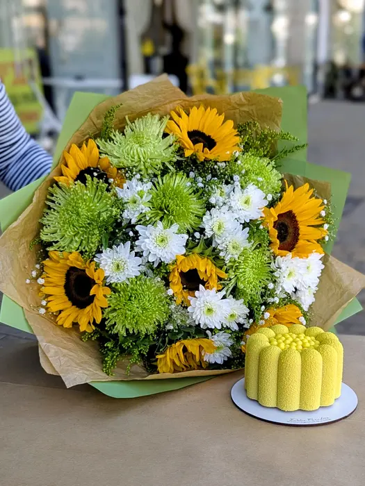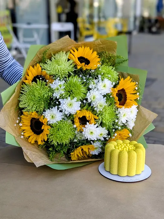 סידור פרחים בקופסא עגולה בשילוב עוגיות