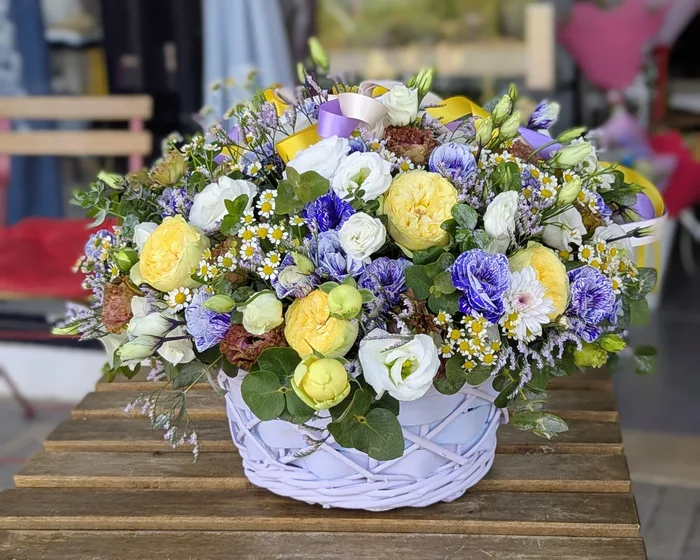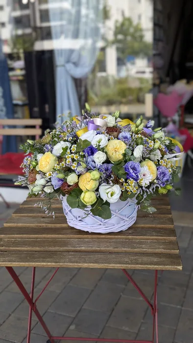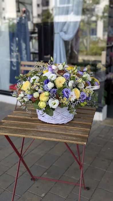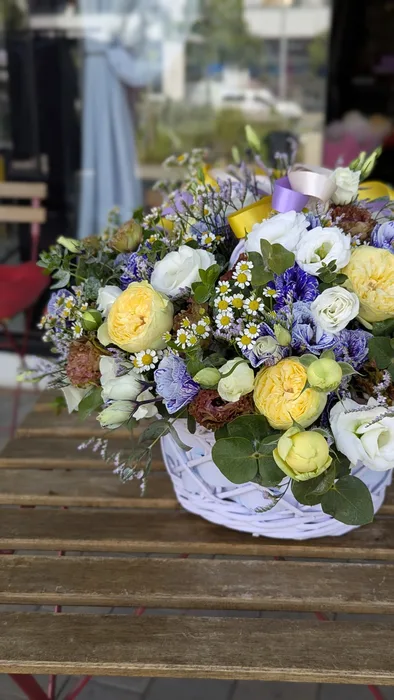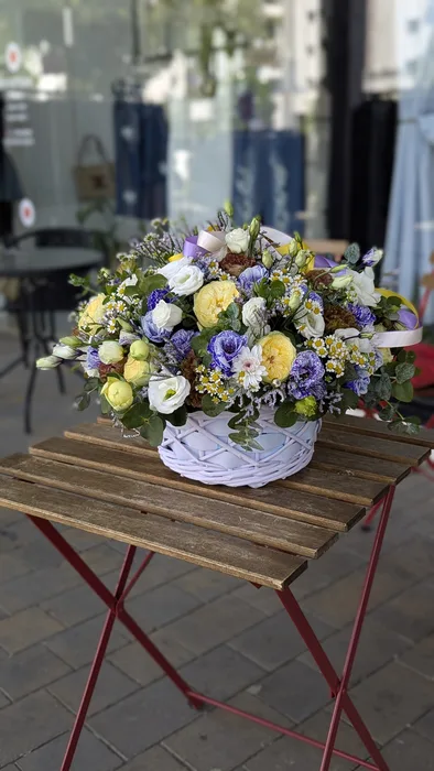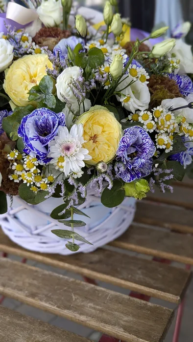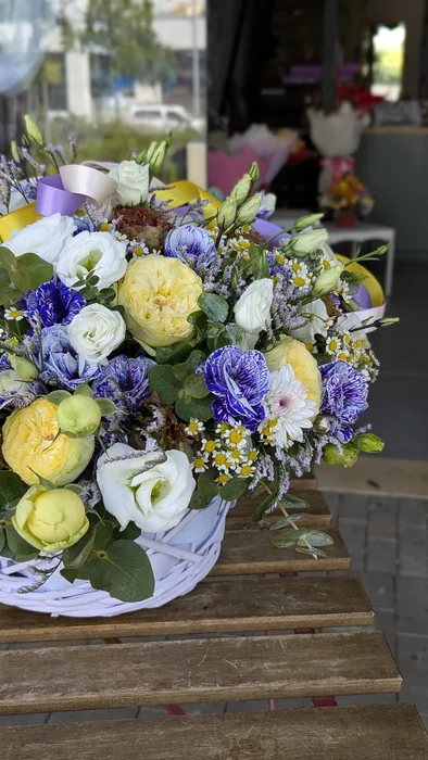 סלסלת פרחים כוללת:ליזיאנטוס, אלסטרומריה, חרצית ושעווה