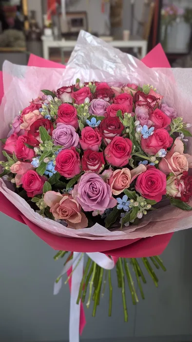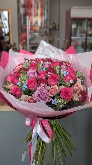 זר מיקס ורדים ורודים עם טווידה