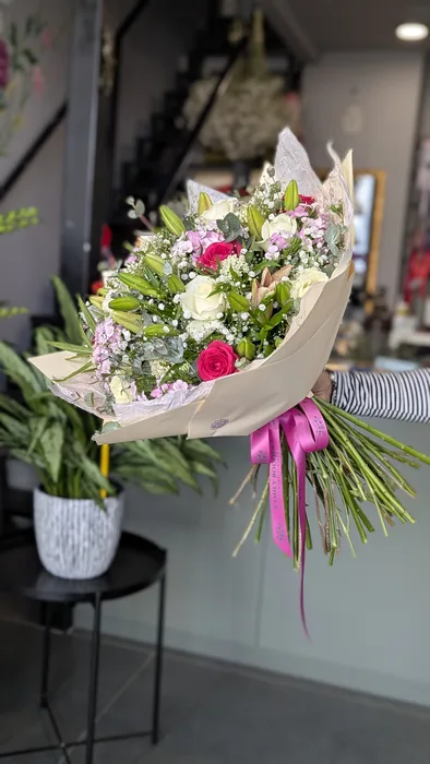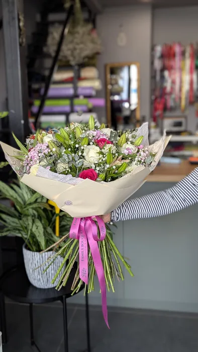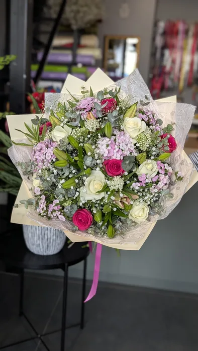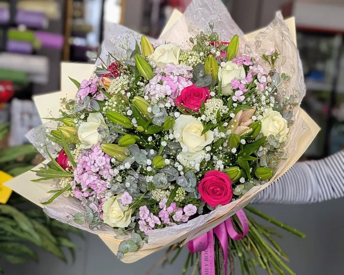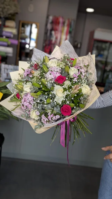 זר פרחים משולב עם ליליות, ורדים וברבדוס