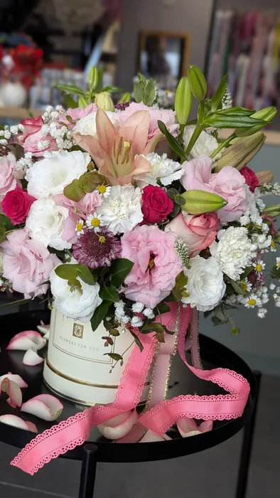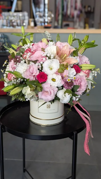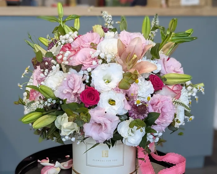 קופסת פרחים בגוונים ורודים